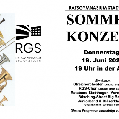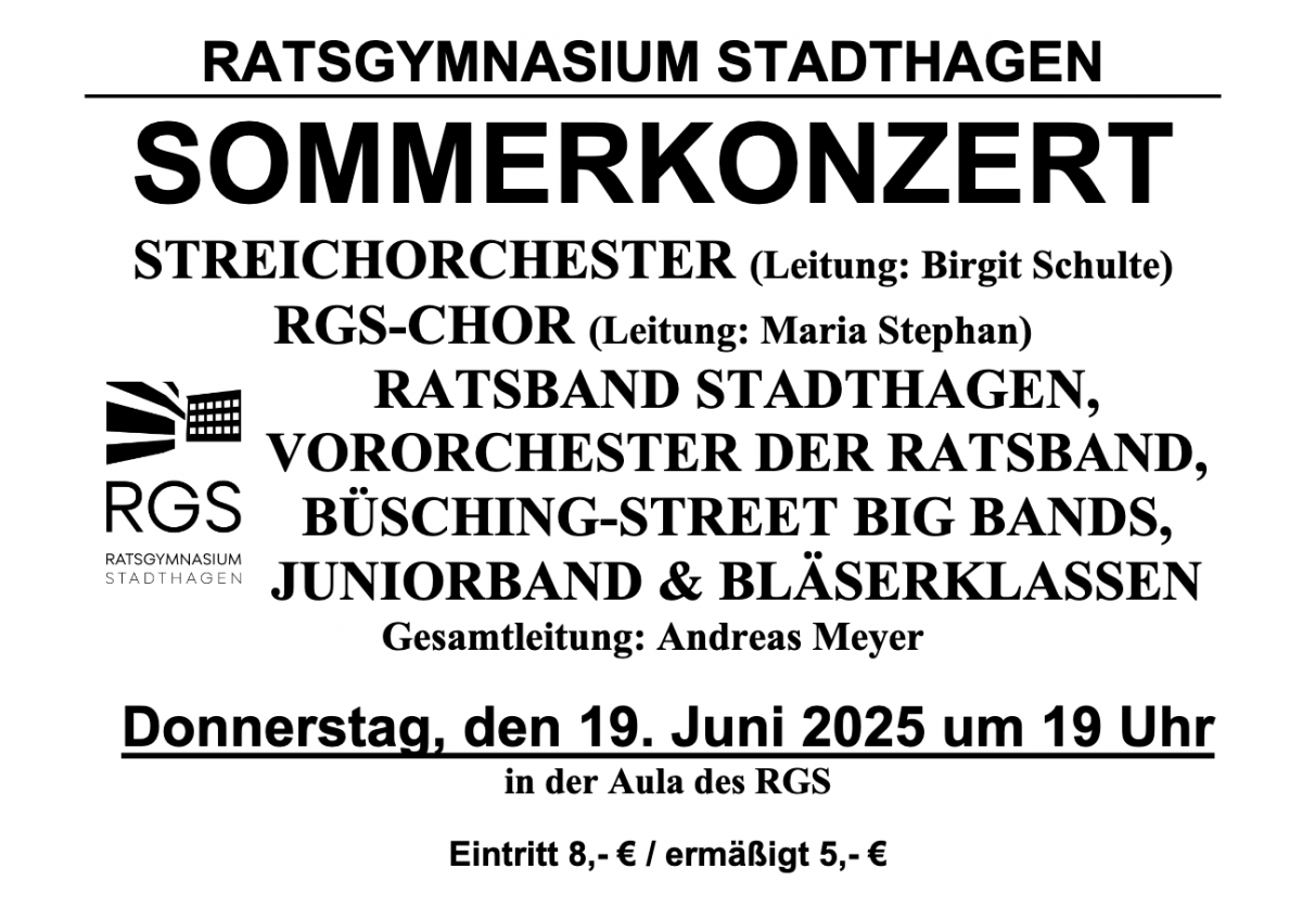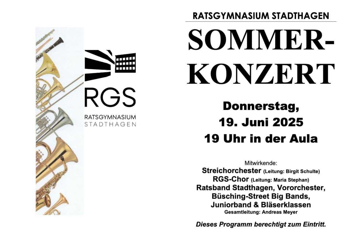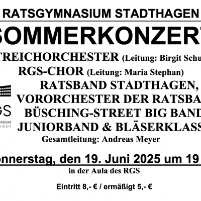 Zum großen Sommerkonzert in der Aula des Ratsgymnasiums Stadthagen am Donnerstag, den 19. Juni 2025 um 19 Uhr laden Chor, Streicher und die Bläserformationen der Schule ganz herzlich ein.