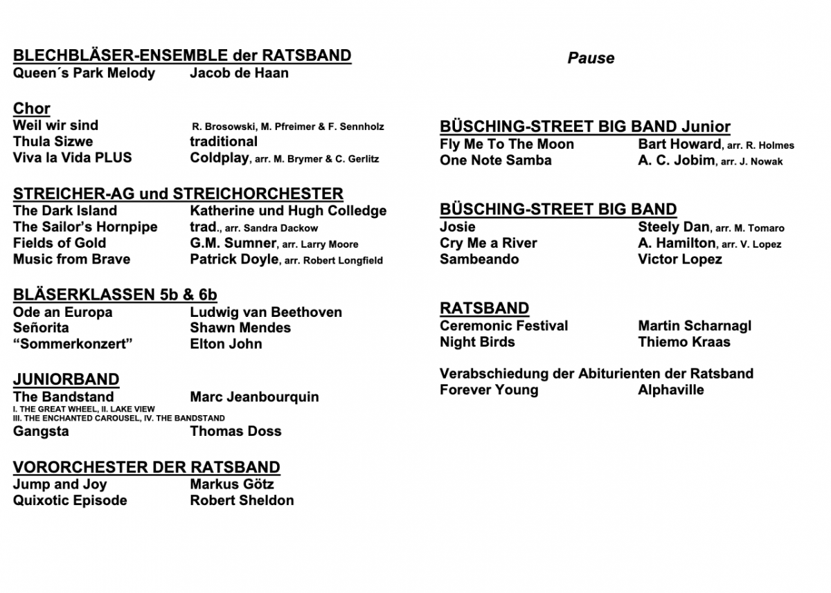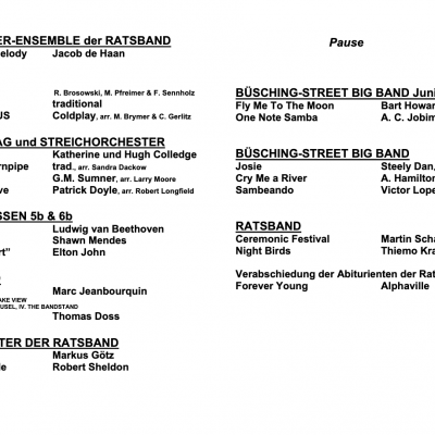 Der Chor wird von Maria Stephan und das Streichorchester von Birgit Schulte geleitet. Die Bläserklassen 5b & 6b, die Juniorband der Ratsband (Blasorchester der Klassen 7 & 8), das Vororchester der Ratsband (Blasorchester der Klassen 9 & 10), die Büsching-Street Big Bands und die Ratsband Stadthagen (Blasorchester der Klassen 11-13) werden unter der Leitung von Andreas Meyer u.a. Originalkompositionen von Robert Sheldon (Quixotic Episode) und Thiemo Kraas (Night Birds) musizieren.