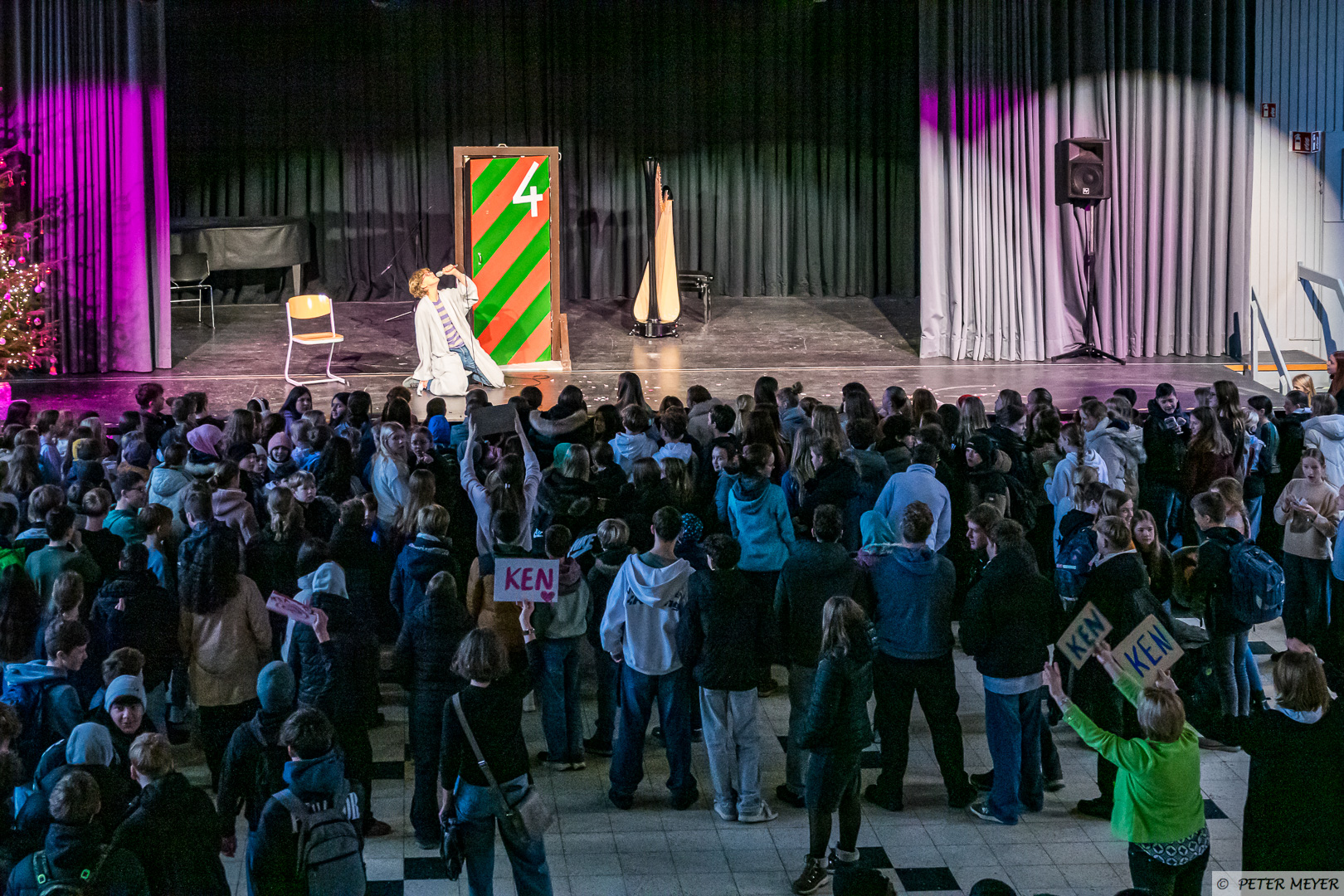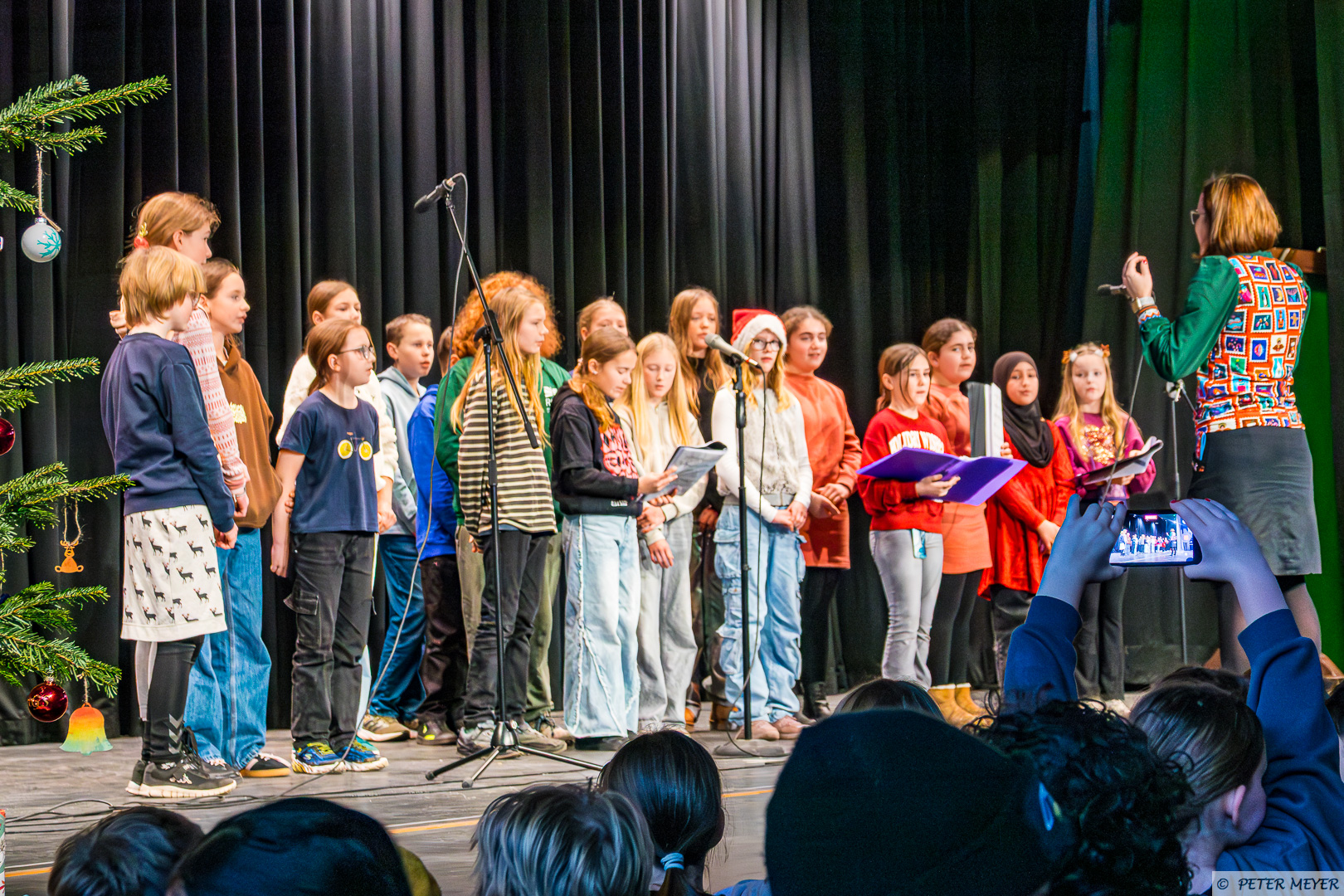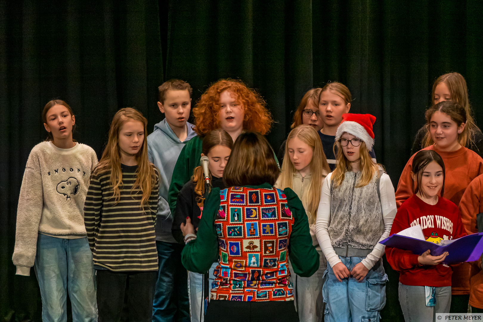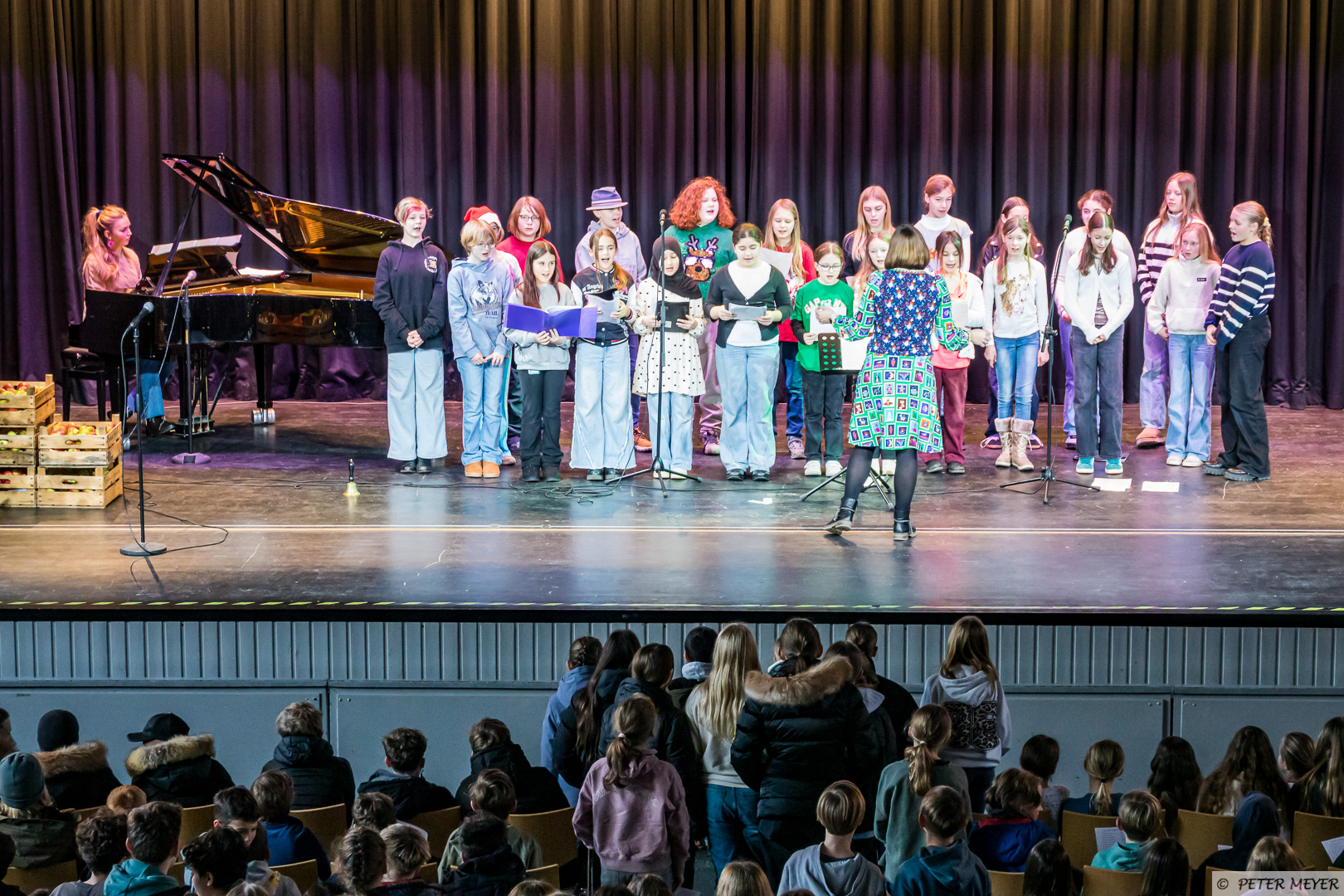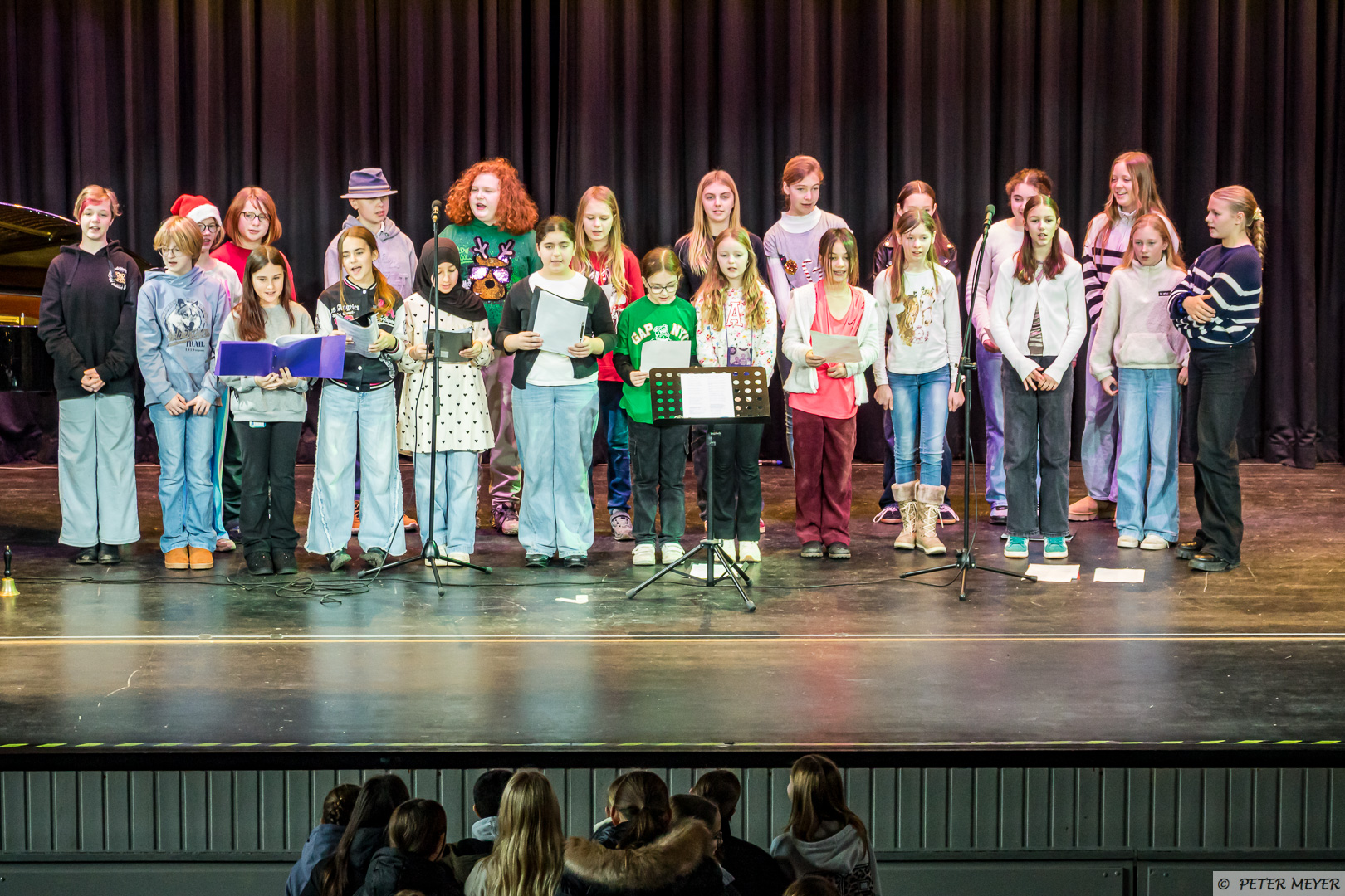 Auch wenn draußen das Wetter nicht nach Winter scheint, so verzauberten heute die Chöre der Jahrgänge 5 bis 8 die Zuschauer mit dem Lied „Kann mich jemand hören“ aus der „Schule der magischen Tiere“ und im Anschluss versetzte das sehr berührende Stück „Ein Licht“ von Niels Schröder die Aula in winterliche Weihnachtsstimmung. Begleitet wurden die Chöre von Eloisa Scharninghausen.