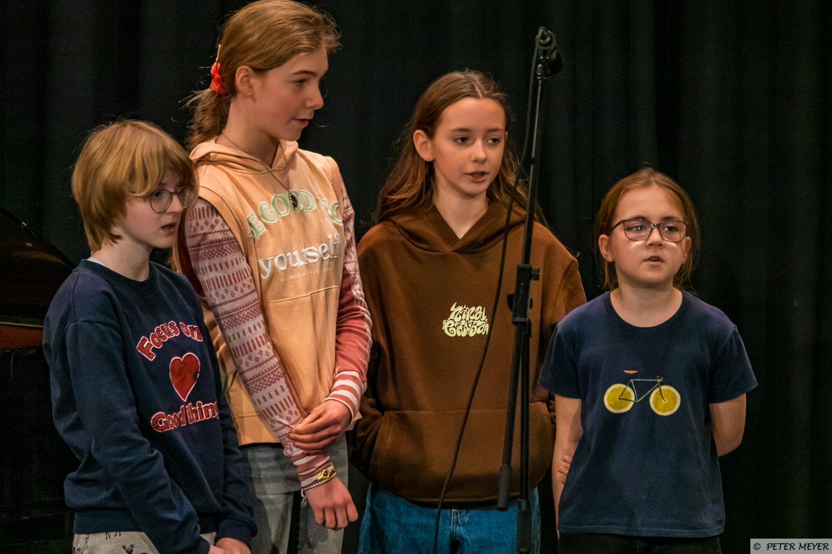 Die Woche begann wieder musiklisch: Johanna Linden, Isabella Stengert, Sam Hirsch und Mona von Frommann (Jahrgang 7) sangen als erstes „So allein“ aus der „Schule der magischen Tiere“ – Teil 1.