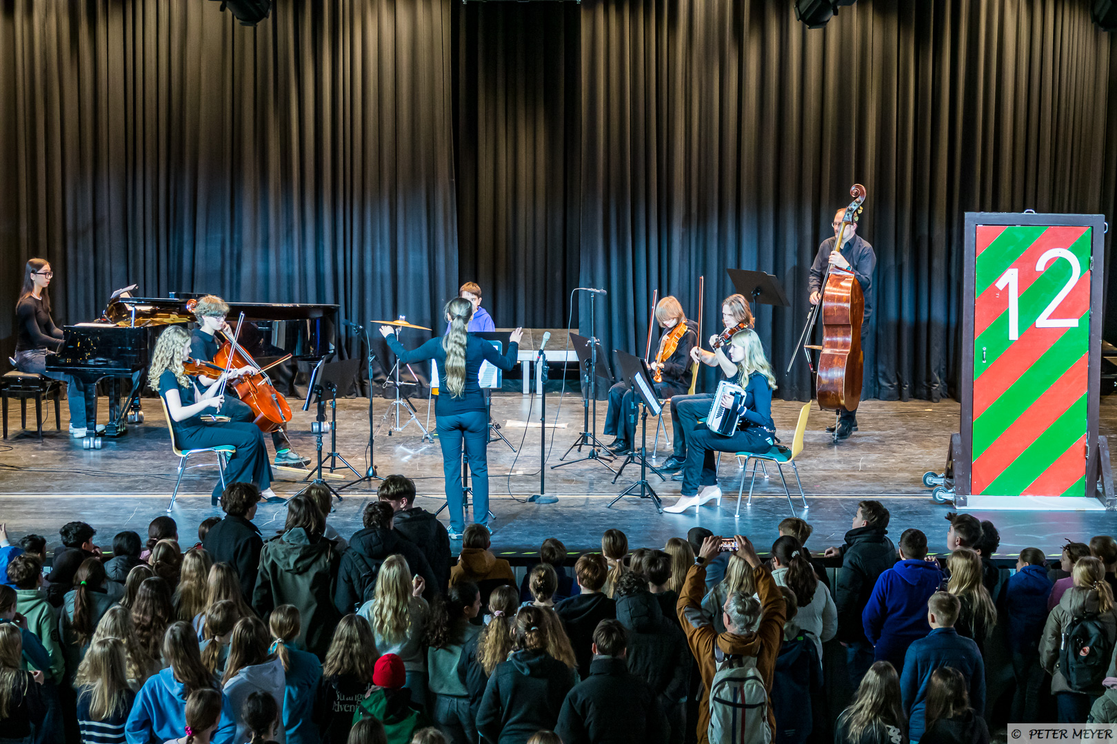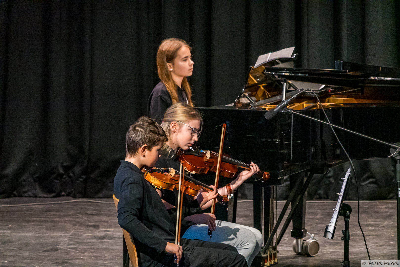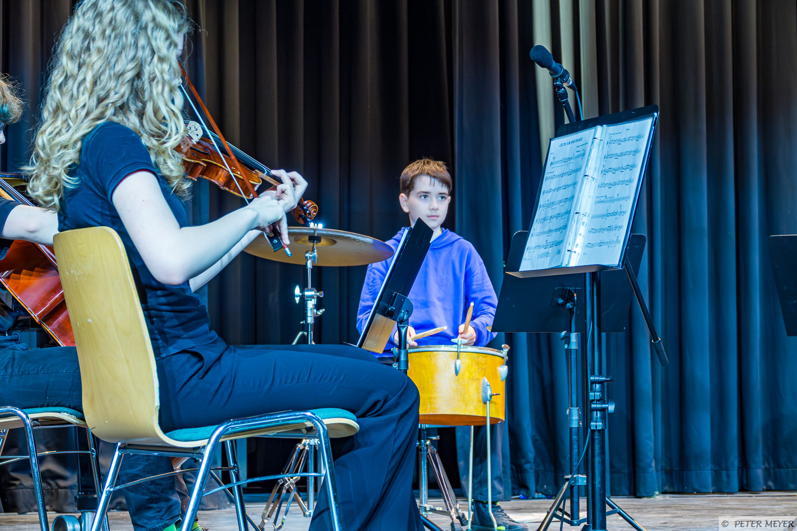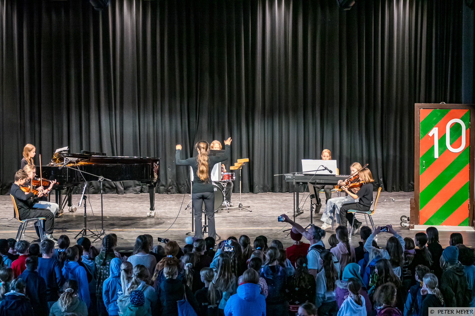 Der Name des Stücks hielt, was er versprach, auch wenn der musikalische Wirbelsturm eher sanft durch die Aula zog. Zusammen mit Schlagzeug, E-Piano und Flügel entfalteten die Streichinstrumente ihre bezaubernde Wirkung und die jungen Musikerinnen und Musiker zeigten, was sie bereits gelernt haben.