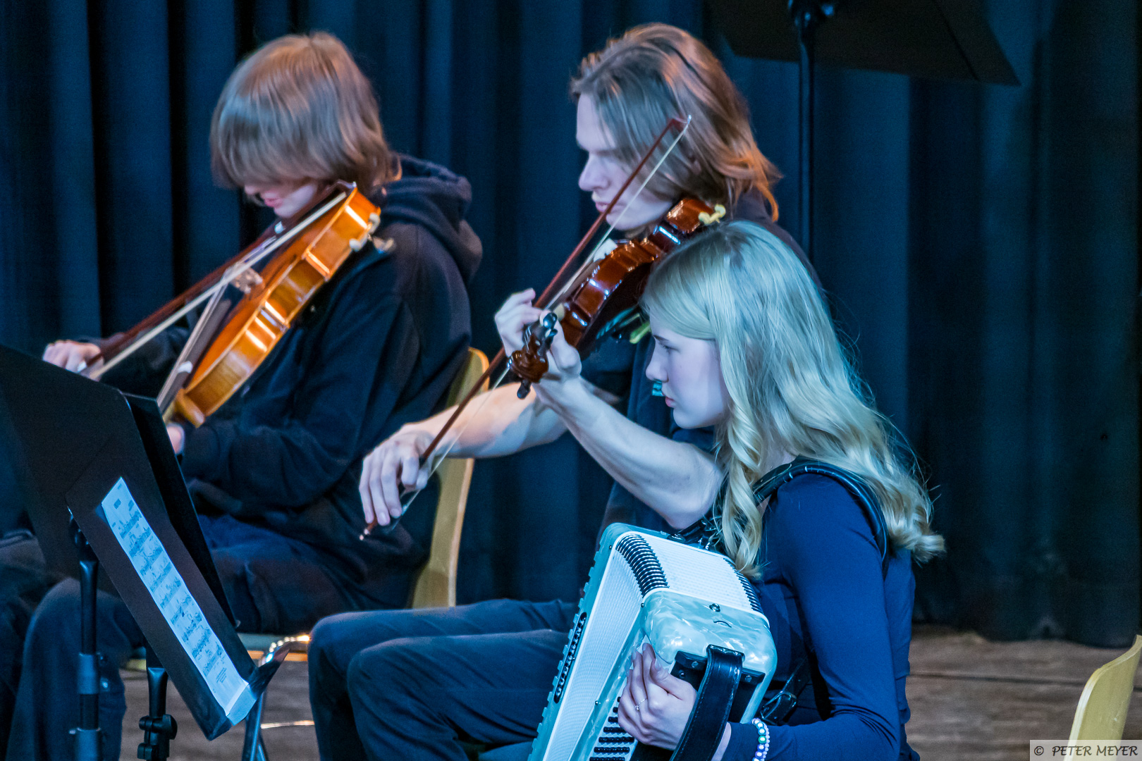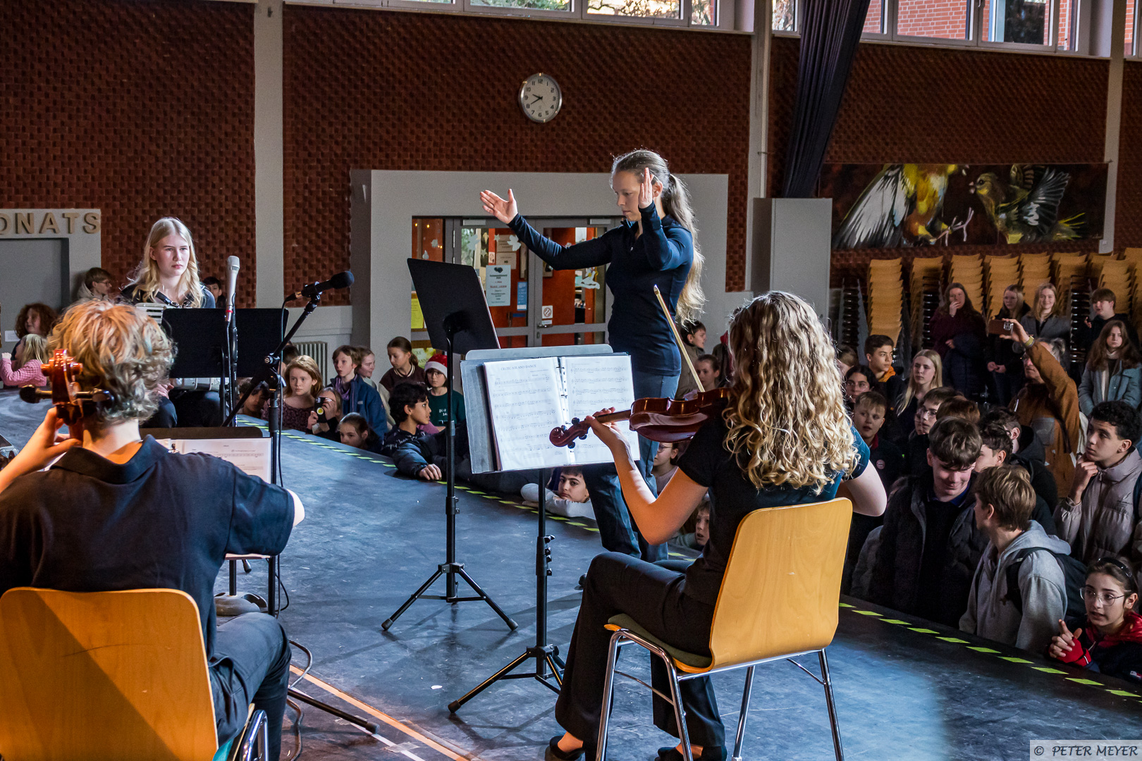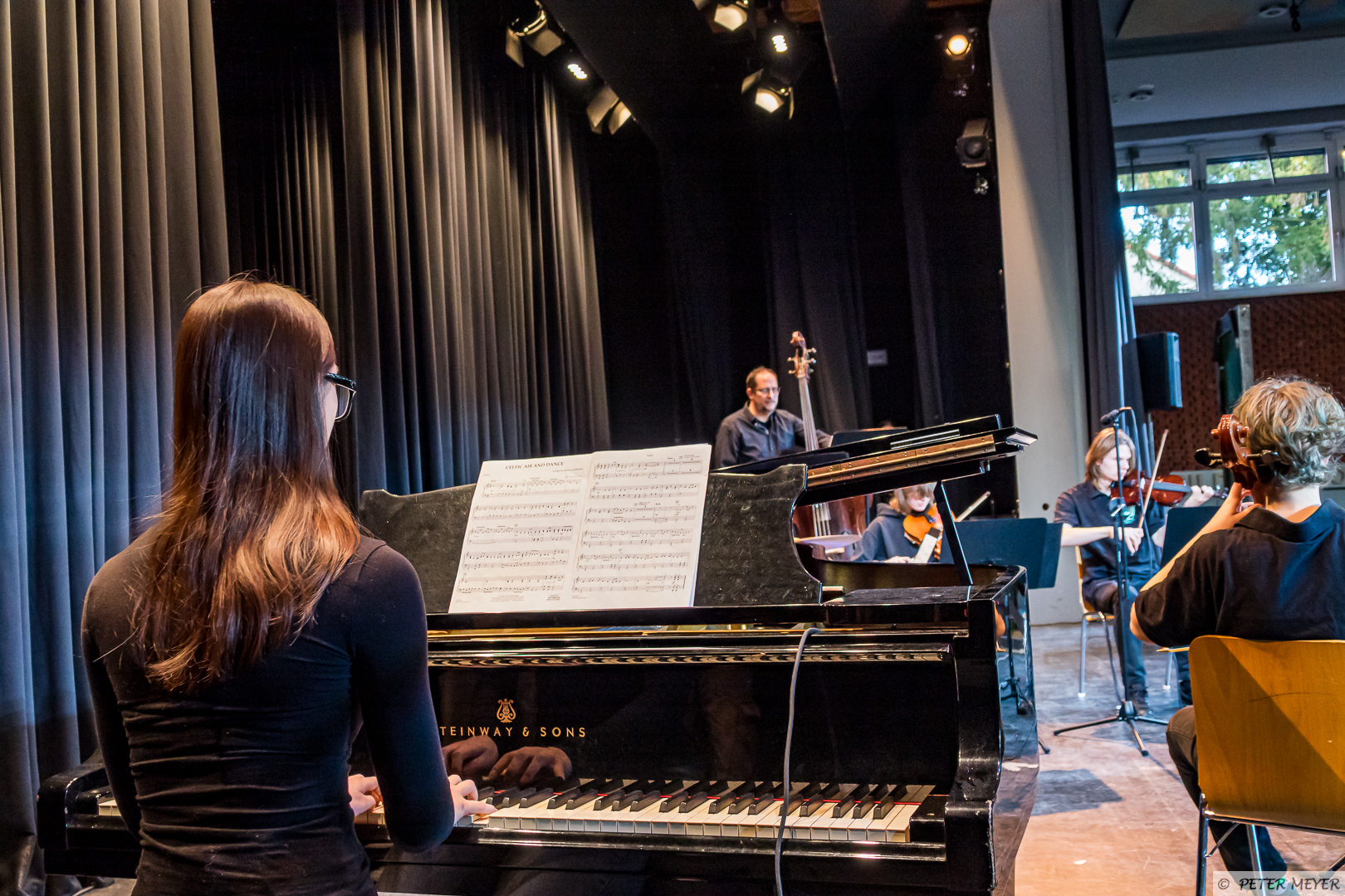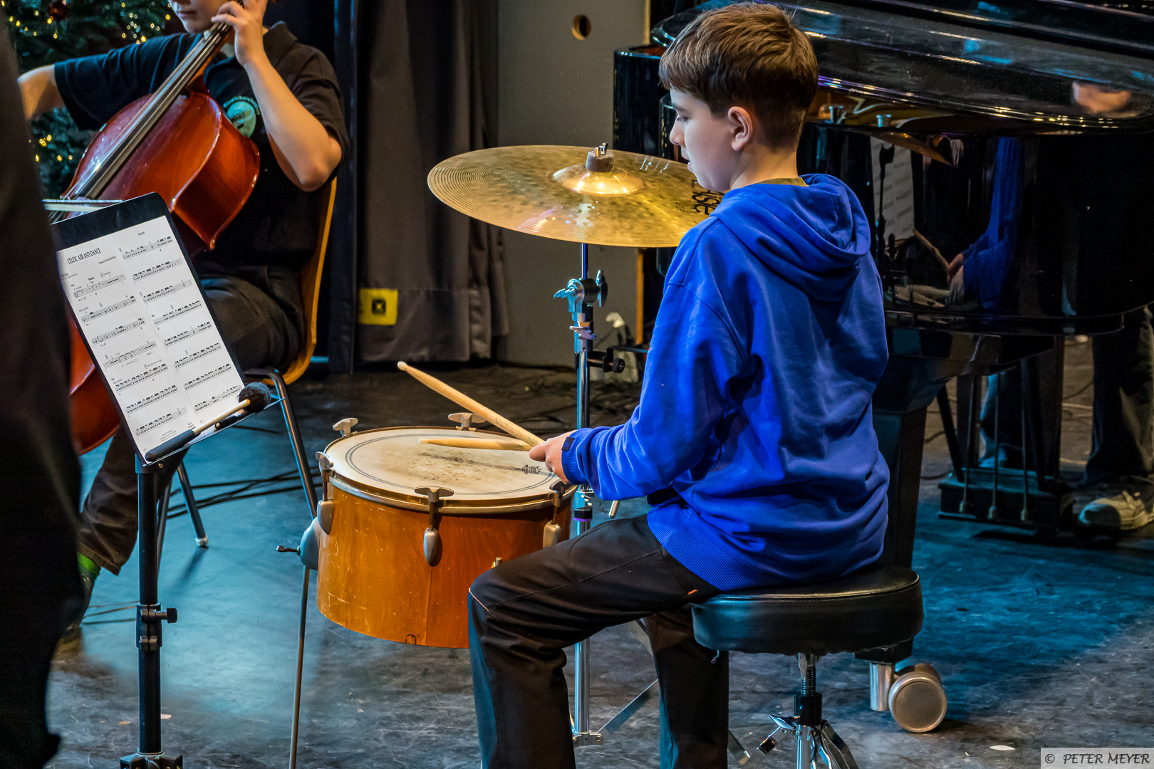 Der Name des Stücks hielt, was er versprach, auch wenn der musikalische Wirbelsturm eher sanft durch die Aula zog. Zusammen mit Schlagzeug, E-Piano und Flügel entfalteten die Streichinstrumente ihre bezaubernde Wirkung und die jungen Musikerinnen und Musiker zeigten, was sie bereits gelernt haben.